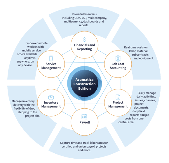 Acumatica Construction management software is a comprehensive construction accounting solution, offering a range of connected applications and modules tailored for the industry's needs. From construction management to financial management, project accounting, payroll, service management, and CRM, it provides a complete suite of tools to streamline operations.