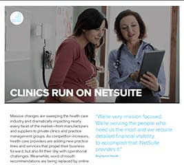 Huge changes are dramatically covering the healthcare industry - from suppliers, manufacturers, private clinics and management groups. Growing clinics are finding that their existing financial business systems are holding them back from competition. Learn why fast-growing medical practice companies are choosing NetSuite to streamline their business.